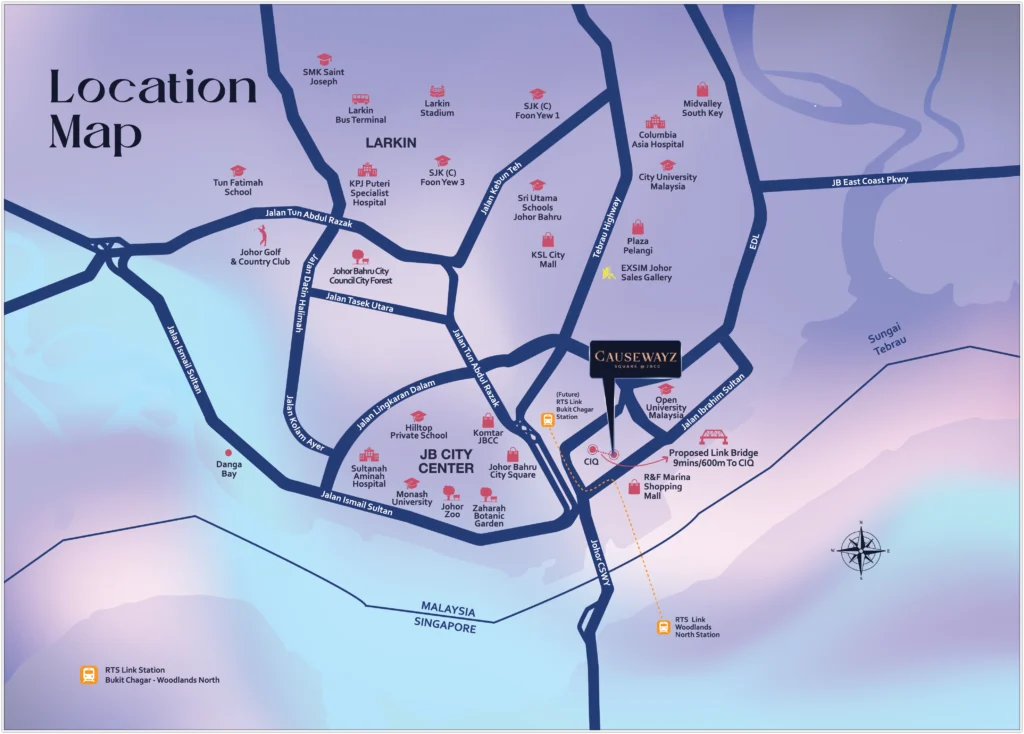 Causewayz Square isn’t just a home-it’s a lifestyle hub and a strategic investment. With its integrated mix of residences, retail, transport connectivity, and proximity to key institutions and malls, it supports the growing wave of cross-border professionals and investors. The RTS Link to Singapore and upcoming ETS service to Kuala Lumpur make this a central node in the region’s expanding transportation grid. As Johor Bahru transforms into a global city, Tower Axis, Brixton, and Dover at Causewayz Square stand at the forefront-ready to connect, inspire, and grow.